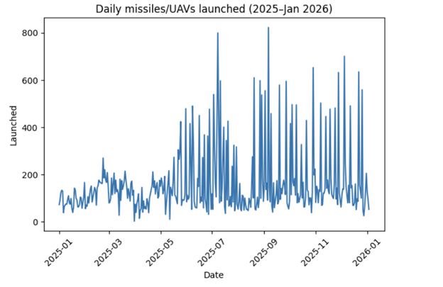 Publicly available reported launch data indicate that the intensity and scope of aerial attacks on Ukraine have continued at an expanded and intense pace since May 2025, with only a brief lull in mid-summer 2025. The most significant trend is that daily salvoes have consistently grown larger. July 9 and September 7 saw strikes of record intensity, with some daily attacks involving over 740 and 800 munitions, respectively. The September strike achieved a rare successful hit on government buildings in central Kyiv.