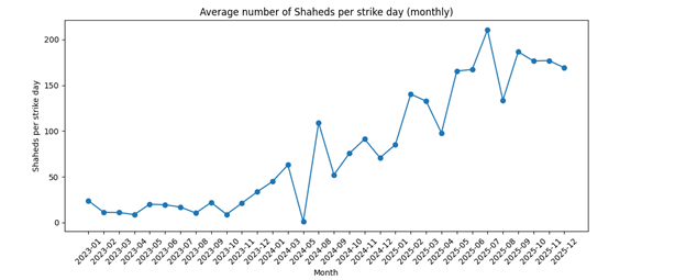 Traditional cruise missiles have overall taken a backseat in operational use to Shahed-pattern systems. Attacks using Shahed-pattern drones are now a near-daily occurrence. Russia is expanding both production sites and operational tempo. Throughout 2023, the average number of Shaheds in a daily strike was less than 50. In 2024, averages crept closer to 100. Since May 2025, the average has reached upwards of 150 per strike, with June 2025 seeing averages exceed 200 per day. While these are averages, the trend clearly demonstrates that Russia can field greater quantities of these munitions in ever-larger salvoes.