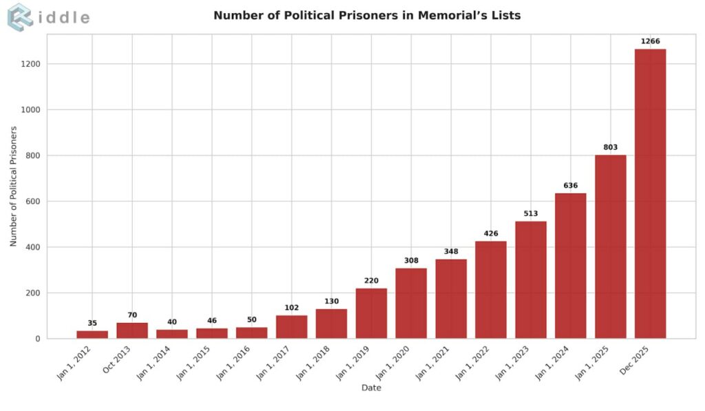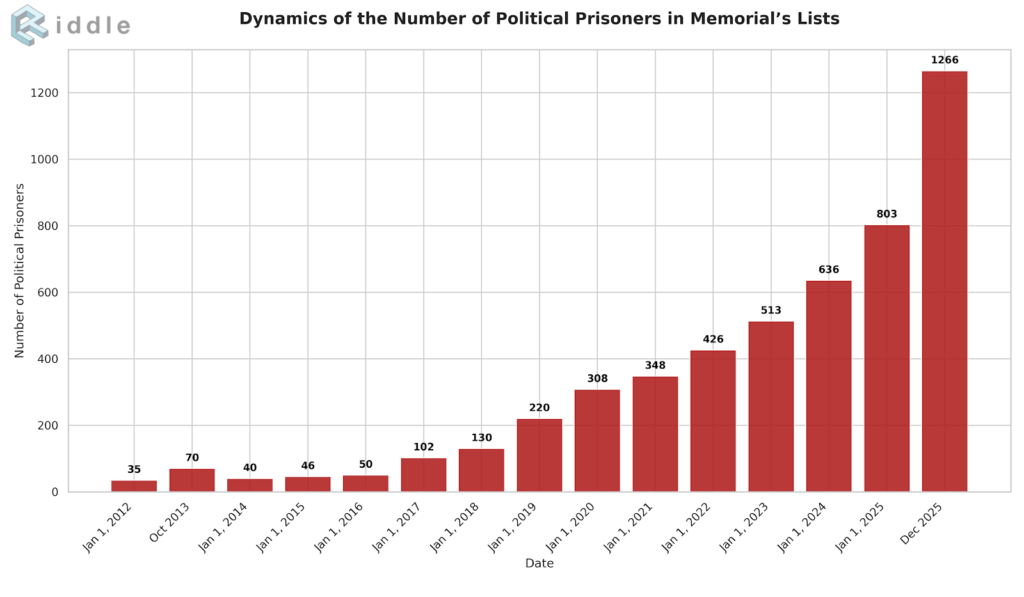 Political repression in Russia did not, of course, appear out of nowhere on February 24, 2022. It had long become a comprehensive instrument of state control over society well before that grim milestone. Even if we confine ourselves to the harshest form—deprivation of liberty through politically motivated criminal prosecutions—the trajectory of such measures reveals much about the development of Russia’s authoritarian regime.