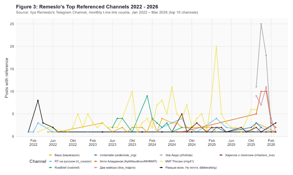 Zov Aida served as an amplifier in support of Akhmat’s commander-in-chief Apti Alaudinov, Deputy Chief of the Main Military-Political Directorate (GVPU) of the Armed Forces of the Russian Federation, amid a heated public dispute between Alaudinov and his critics within the military blogging community. The dispute revolved around criticism of Chechen battalions and the financial transactions related to donations for the front, which were collected by competing milblogger groups. Remeslo was initially a fierce critic of Akhmat. However, after an apparent personal threat from Alaudinov and a joint video declaring that the dispute had been settled, Remeslo intervened forcefully on Alaudinov’s side. Between November and December 2025, he produced 51 posts sharing Alaudinov’s own content. Alongside these, the highly manipulative, pro-Kremlin pseudo-investigative project Underside (underside_org) appeared 32 times as Remeslo amplified its exposés of allegedly Western-funded opposition networks in Russia—filing an official FSB complaint based on one of its investigations. This can be considered the final phase of Remeslo’s loyalist activities, during which he acted ostentatiously as a Kremlin attack dog. In January-March 2026, VLager’ returned to the top with 32 forwards, while Zov Aida and Dva Maiora remained present at a much lower scale. However, the anti-foreign influence channel Underside vanished entirely from Remeslo’s channel in 2026.