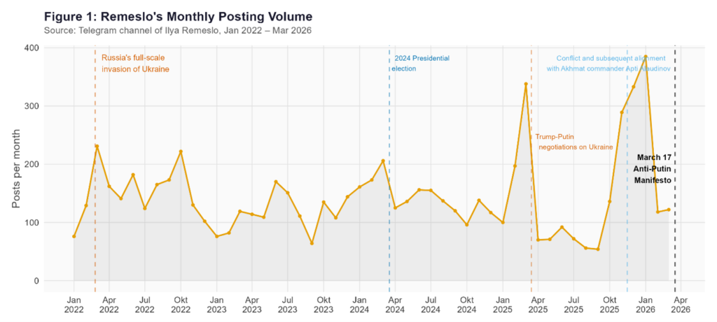 When did Remeslo’s narrative turn against the regime and Putin more specifically? Using Remeslo’s Telegram channel as a benchmark, January/February 2026 appears to have been a turning point in his rhetoric. While we can reject his claims that he had held and expressed the views of the six-point manifesto for many years, the timing of his shift coincides with several crucial internal debates within Russia’s regime and society more broadly—debates whose contours are visible in the themes of his channel.