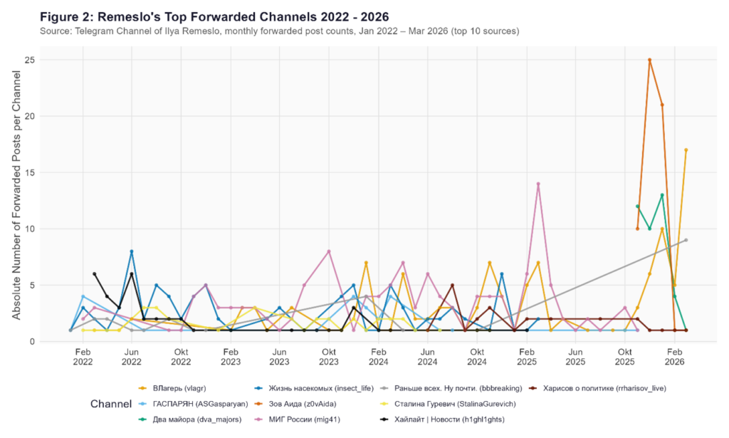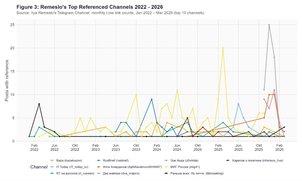 Figures 2 and 3 track which channels Remeslo forwarded from and linked to over time. Before October 2025, his information ecosystem was dominated by two sources: MIG Rossii (mig41), a major war-blogger account with more than 500,000 subscribers, which accounted for 128 forwards and 166 references in the January 2022-September 2025 period, making it by far his primary amplification source. VLager’ (vlagr) ranked second with 77 forwards. Both channels relayed a pro-Kremlin analytical line on the war and geopolitics.