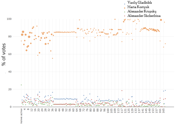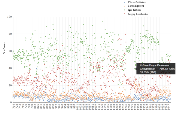 The scams have gotten so brazen that you don’t need to be on-site or pack a data-crunching PhD to spot them. Just plot precinct results by number on a graph, and the fakery leaps out. Take Figure 2: governor’s race in the Jewish Autonomous Oblast, where official numbers handed Maria Kostyuk a «landslide» over 83%. You can see the dead-straight bands of near-identical tallies across dozens of precincts, plus a few shorter streaks. In a clean vote? No way—even neighboring precincts in the same building shouldn’t sync up like that.