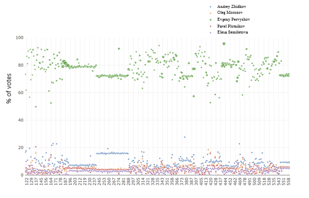 Fig. 2. Gubernatorial election results in the Jewish Autonomous Oblast by precinct. Data source: Vyboroteka website