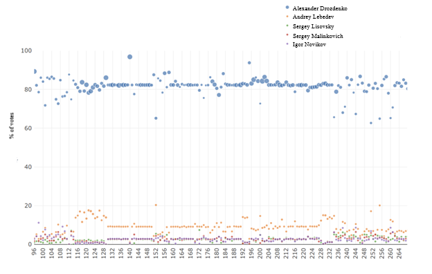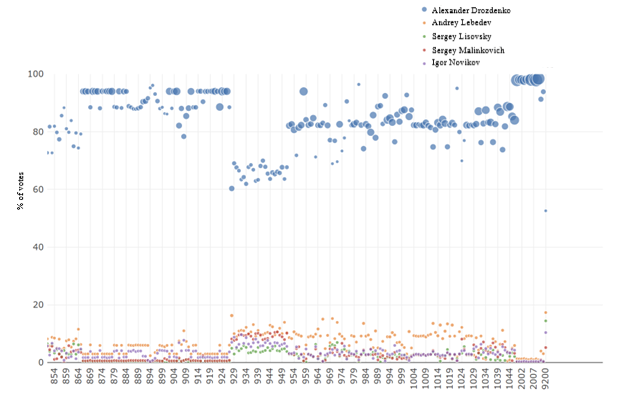 Leningrad Oblast’s election boards took openness to a whole new level (see Figures 4 and 5, or the interactive graph). Figure 5 shows those uniform-result bands—pre-planned quotas, basically—popping up at 94% and even 98% for the incumbent. Bottom line: the whole region’s a fraud-free zone? Yeah, right.