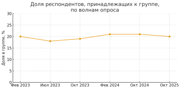 В данных 14-й волны «Хроник» (февраль 2025 года) есть ряд вопросов, комбинация которых позволяет выделить не только противников войны, но и активных противников режима. Для формирования этой группы используются три параметра: