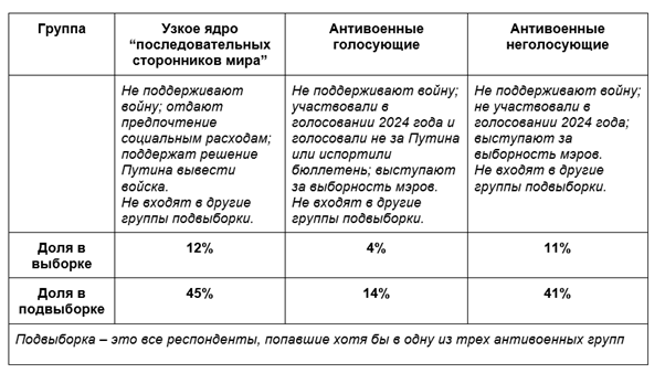 Полученная таким образом группа «антивоенных голосующих» составляет всего 4% от общей выборки. При этом почти 80% ее представителей входят в более широкую категорию «последовательных сторонников мира». Однако лишь 14% «последовательных сторонников мира» проявляют политическую активность и попадают в категорию «антивоенных голосующих». Иными словами, политически активные противники войны — это лишь небольшая часть гораздо более широкого антивоенного поля, большая часть которого сознательно отказывается от участия в выборах.