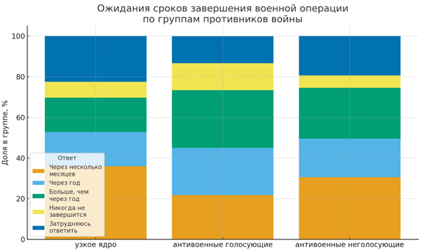 По ожиданиям длительности войны группы тоже заметно расходятся. Респонденты из «узкого ядра» чаще других верят в относительно скорый конец: 36% ждут завершения «через несколько месяцев», а доля считающих, что война продлится «больше года» или «никогда не закончится», у них ниже среднего. При этом именно у них самая высокая доля затруднившихся с прогнозом — 23%. «Антивоенные голосующие» значительно пессимистичнее: среди них меньше всего ответов «несколько месяцев» (22%) и больше всего тех, кто считает, что война продлится «больше года» (28%) или «никогда не завершится» (13%). «Антивоенные неголосующие» занимают промежуточную позицию: по ожиданиям они ближе к «узкому ядру», но с меньшей долей крайних пессимистов («никогда не завершится»). Получается, что именно политически активные, участвующие в выборах противники войны чаще всего воспринимают ее как затяжную и почти безнадежную, тогда как остальные либо сохраняют осторожную надежду на относительно скорый финал, либо предпочитают вообще не делать прогнозов.